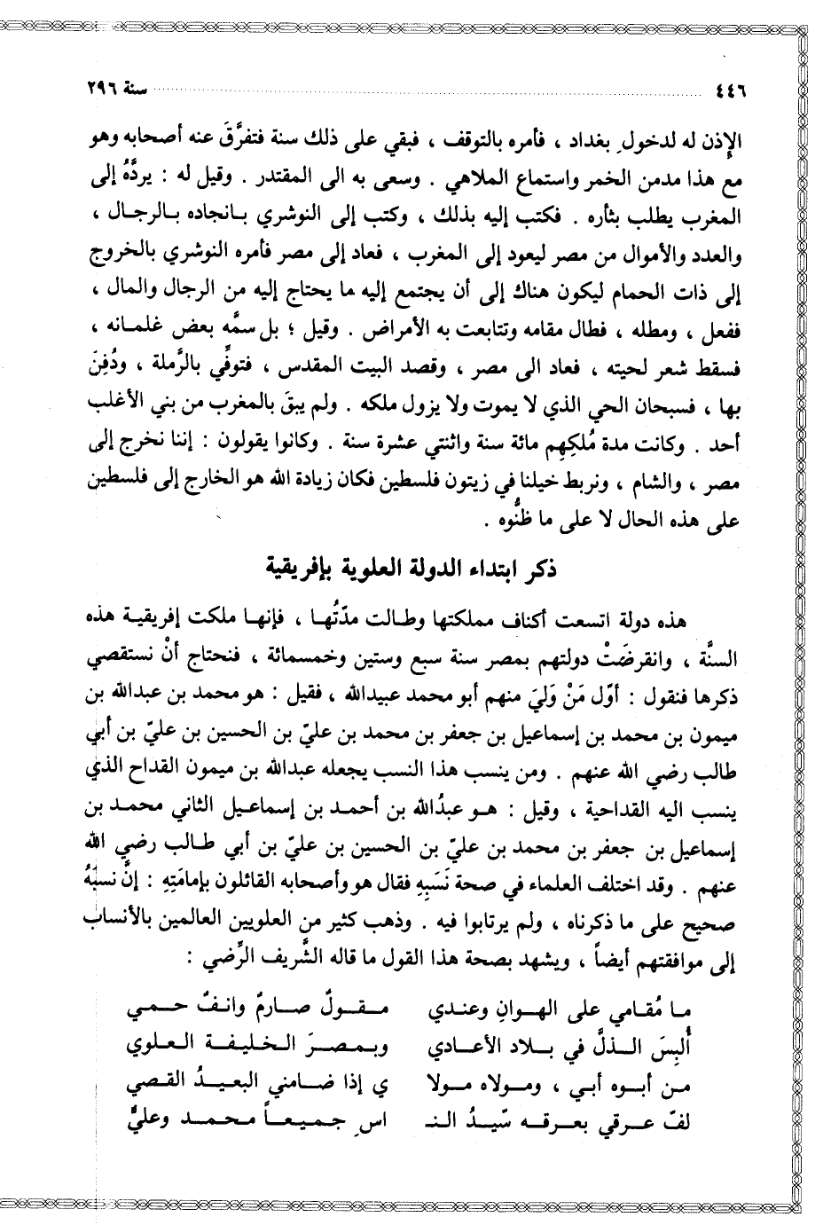 هذه دولة اتسعت أكناف مملكتها وطالت مدتها فإنها ملكت إفريقية هذه السنة وانقرضت دولتهم بمصر سنة سبع وستين وخمسمائة فنحاج أن نستقصي ذكرها فنقول أول من ولي منهم أبو محمد عبيد الله فقيل هو محمد بن عبد الله بن ميمون بن محمد بن إسماعيل بن جعفر بن محمد بن علي بن الحسين بن علي بن أبي طالب رضي الله عنهم