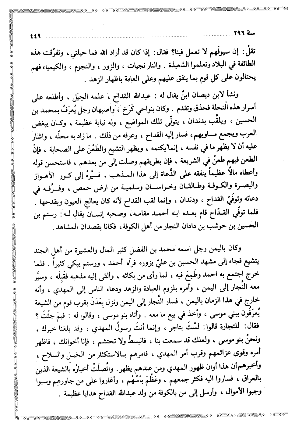 فلما توفي القداح قام بعده ابنه أحمد في مقامه وصحبه إنسان يقال له رستم بن الحسين بن حوشب بن دادان النجار من أهل الكوفة فكانا يقصدان المشاهد
