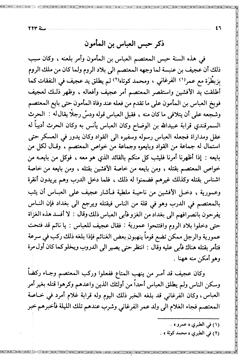في هذه السنة حبس المعتصم العباس بن المأمون وأمر بلعنه كان سبب ذلك أن عجيف بن عنبسة لما وجهه المعتصم إلى بلاد الروم ولما كان من ملك الروم بزبطرة مع عمر الفرغاني ومحمد كوتاه لم يطلق يد عجيف في النفقات كما أطلقت يد الأفشين واستقصر المعتصم أمر عجيف وأفعاله وظهر ذلك لعجيف فوبخ العباس بن المأمون على ما تقدم من فعله عند وفاة المأمون حتى بايع المعتصم وشجعه على أن يتلافى ما كان منه فقبل العباس قوله ودس رجلا يقال له الحرث السمرقندي قرابة عبيد الله بن الوضاح وكان العباس يأنس به وكان الحرث أديبا له عقل ومداراة فجعله العباس رسوله وسفيره إلى القواد وكان يدور في العسكر حتى استمال له جماعة من القواد وبايعوه وجماعة من خواص المعتصم وقال لكل من بايعه إذا أظهرنا أمرنا فليثب كل منكم بالقائد الذي هو معه فوكل من بايعه من خواص المعتصم بقتله ومن بايعه من خواص الأفشين بقتله ومن بايعه من خواص أشناس بقتله وكذلك غيرهم فضمنوا له ذلك فلما دخل الدرب وهم يريدون أنقرة وعمورية دخل الأفشين من ناحية ملطية فأشار عجيف على العباس أن يثب بالمعتصم في الدرب وهو في قلة من الناس فيقتله ويرجع إلى بغداد فإن الناس يفرحون بانصرافهم إلى بغداد من الغزو فأبى العباس ذلك وقال لا أفسد هذه الغزاة حتى يدخلوا بلاد الروم وافتتحوا عمورية فقال عجيف للعباس يا نائم قد فتحت عمورية والرجل ممكن تضع قوما ينهبون بعض الغنائم فإذا بلغه ذلك ركب في سرعة فتأمر بقتله هناك فأبى عليه وقال انتظر حتى يصير إلى الدروب ويخلو كما كان أول مرة وهو أمكن منه ههنا