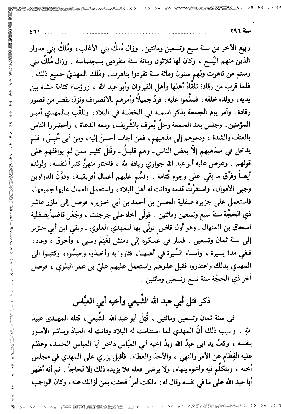 في سنة ثمان وتسعين ومائتين قتل أبو عبد الله الشيعي قتله المهدي عبيد الله