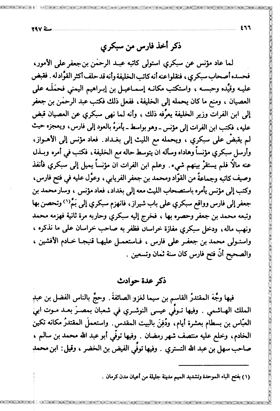 وعلم ابن الفرات أن مؤنسا يميل إلى سبكري فأنفذ وصيف كاتبه وجماعة من القواد ومحمد بن جعفر الفريابي وعول عليه في فتح فارس وكتب إلى مؤنس يأمره باستصحاب الليث معه إلى بغداد فعاد مؤنس وسار محمد بن جعفر إلى فارس وواقع سبكري على باب شيراز فانهزم سبكري إلى بم وتحصن بها وتبعه محمد بن جعفر وحصره بها فخرج إليه سبكري وحاربة مرة ثانية فهزمه محمد ونهب ماله ودخل سبكري مفازة خراسان فظفر به صاحب خراسان على ما نذكره واستولى محمد بن جعفر على فارس فاستعمل عليها قنبجا خادم الأفشين والصحيح أن فتح فارس كان سنة ثمان وتسعين