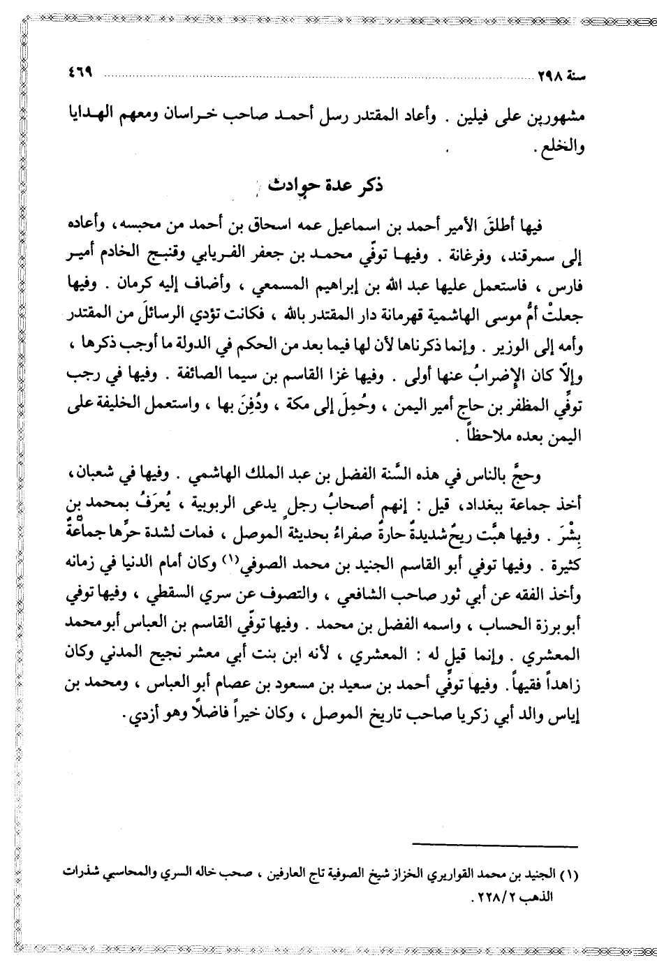وفيها توفي أبو القاسم الجنيد بن محمد الصوفي وكان أمام الدنيا في زمانه وأخذ الفقه عن أبي ثور صاحب الشافعي والتصوف عن سري السقطي وفيها توفي أبو برزة الحساب واسمه الفضل بن محمد