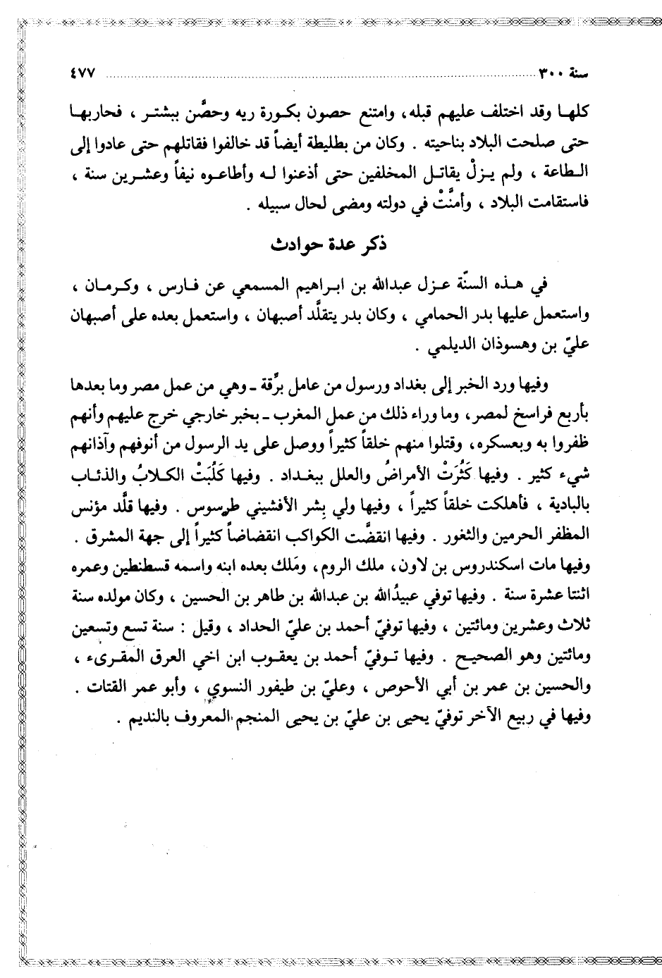 وفيها توفي عبيد الله بن عبد الله بن طاهر بن الحسين وكان مولده سنة ثلاث وعشرين ومائتين وفيها توفي أحمد بن علي الحداد وقيل سنة تسع وتسعين ومائتين وهو الصحيح