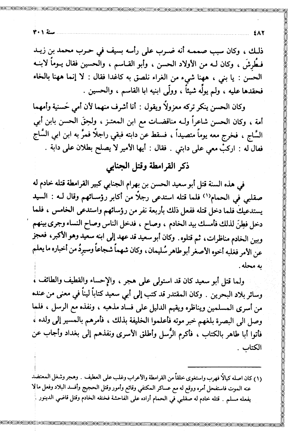 في هذه السنة قتل أبو سعيد الحسن بن بهرام الجنابي كبير القرامطة قتله خادم له صقلبي في الحمام فلما قتله استدعى رجلا من أكابر رؤسائهم وقال له السيد يستدعيك فلما دخل قتله ففعل ذلك بأربعة نفر من رؤسائهم واستدعى الخامس فلما دخل فطن لذلك فأمسك بيد الخادم وصاح فدخل الناس وصاح النساء وجرى بينهم وبين الخادم مناظرات ثم قتلوه