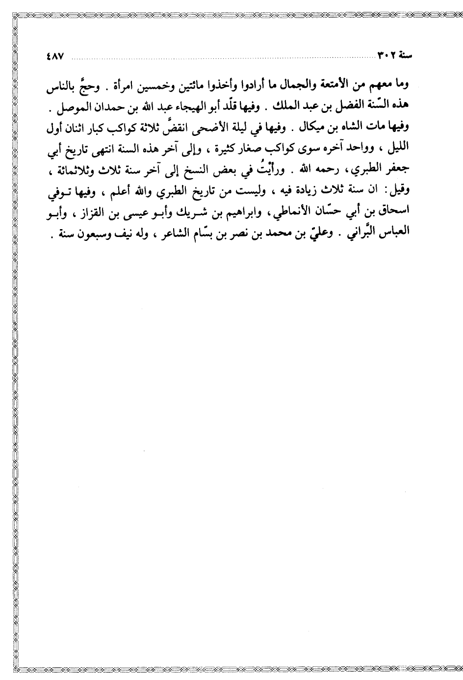 ورأيت في بعض النسخ إلى آخر سنة ثلاث وثلاثمائة وقيل ان سنة ثلاث زيادة فيه وليست من تاريخ الطبري والله أعلم وفيها توفي إسحاق بن أبي حسان الأنماطي وإبراهيم بن شريك وأبو عيسى بن القزاز وأبو العباس البراني