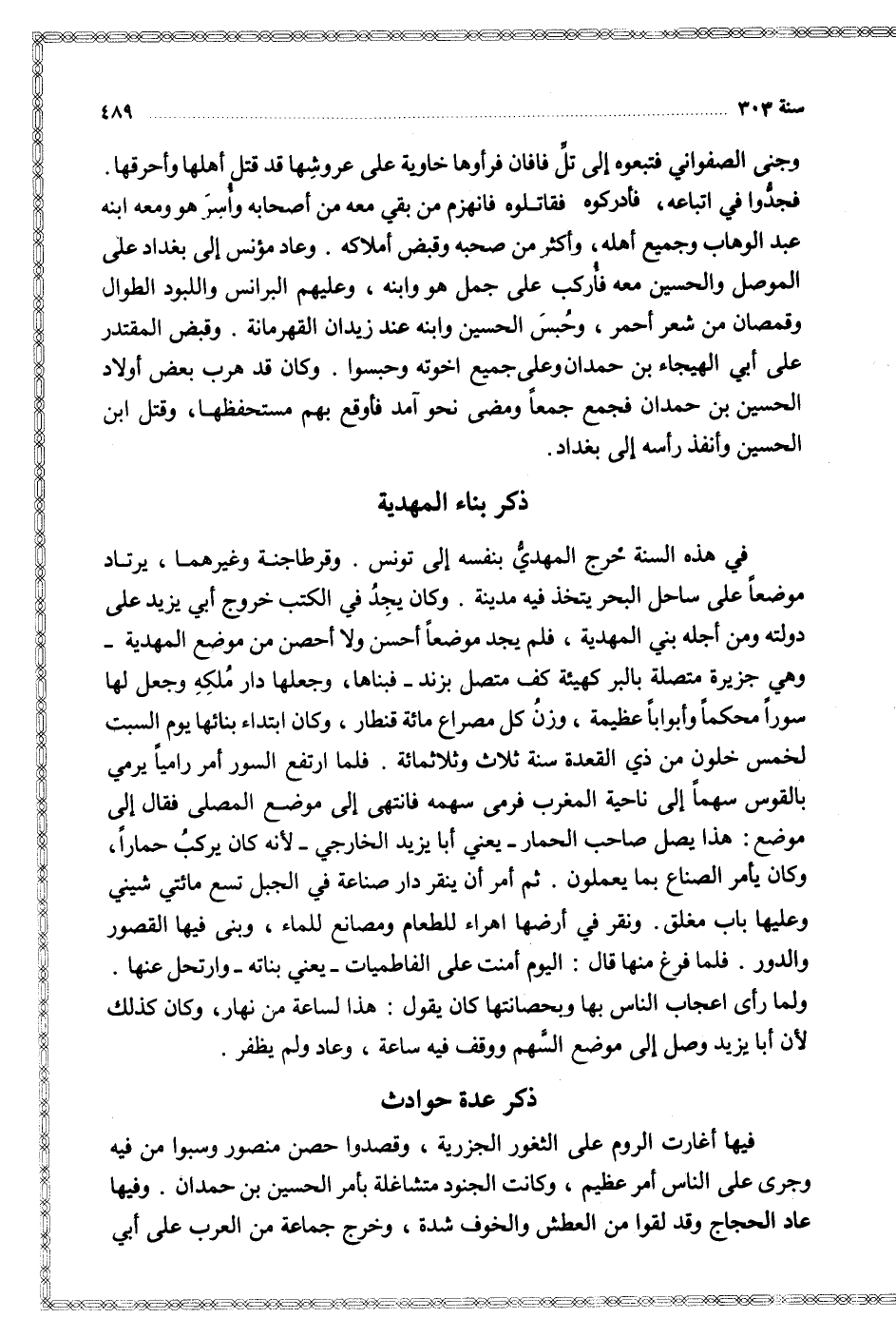 وكان يجد في الكتب خروج أبي يزيد على دولته ومن أجله بنى المهدية فلم يجد موضعا أحسن ولا أحصن من موضع المهدية وهي جزيرة متصلة بالبر كهيئة كف متصل بزند فبناها وجعلها دار ملكه وجعل لها سورا محكما وأبوبا عظيمة وزن كل مصراع مائة قنطار وكان ابتداء بنائها يوم السبت لخمس خلون من ذي القعدة سنة ثلاث وثلاثمائة