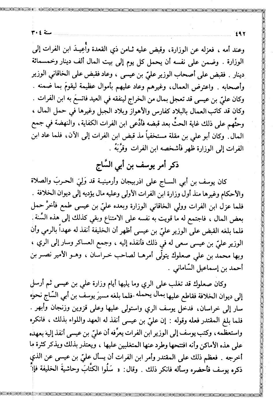 فلما عزل ابن الفرات وولي الخاقاني الوزارة وبعده علي بن عيسى طمع فأخر حمل بعض المال فاجتمع له ما قويت به نفسه على الامتناع وبقي كذلك إلى هذه السنة