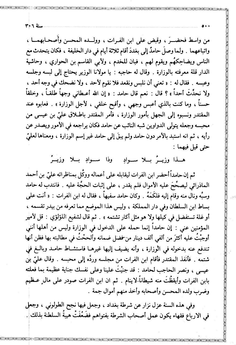ثم ان ابن الفرات صودر على مال عظيم وضرب ولده المحسن وأصحابه وأخذ منهم أموال جمة