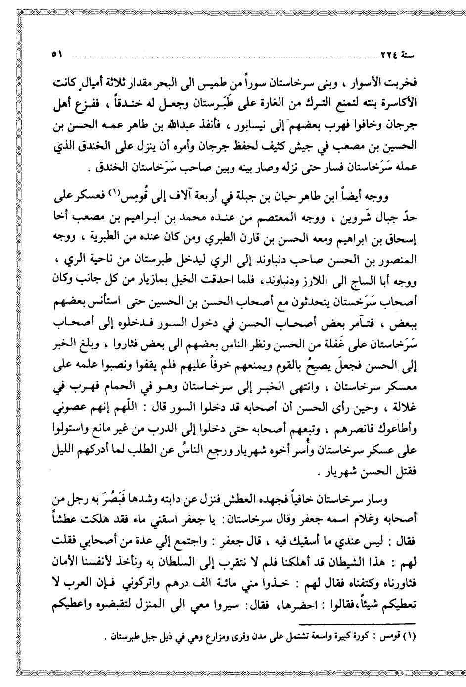 ووجه أيضا ابن طاهر حيان بن جبلة في أربعة آلاف إلى قومس فعسكر على حد جبال شروين ووجه المعتصم من عنده محمد بن إبراهيم بن مصعب أخا إسحاق بن إبراهيم ومعه الحسن بن قارن الطبري ومن كان عنده من الطبرية ووجه المنصور بن الحسن صاحب دنباوند إلى الري ليدخل طبرستان من ناحية الري ووجه أبا الساج إلى اللارز ودنباوند فلما أحدقت الخيل بمازيار من كل جانب وكان أصحاب سرخستان يتحدثون مع أصحاب الحسن بن الحسين حتى استأنس بعضهم ببعض فتآمر بعض أصحاب الحسن في دخول السور فدخلوه إلى أصحاب سرخاستان على غفلة من الحسن ونظر الناس بعضهم إلى بعض فثاروا وبلغ الخبر إلى الحسن فجعل يصيح بالقوم ويمنعهم خوفا عليهم فلم يقفوا ونصبوا علمه على معسكر سرخاستان وانتهى الخبر إلى سرخاستان وهو في الحمام فهرب في غلالة وحين رأى الحسن أن أصحابه قد دخلوا السور قال اللهم إنهم عصوني وأطاعوك فانصرهم وتبعهم أصحابه حتى دخلوا إلى الدرب من غير مانع واستولوا على عسكر سرخاستان وأسر أخوه شهريار ورجع الناس عن الطلب لما أدركهم الليل فقتل الحسن شهريار
