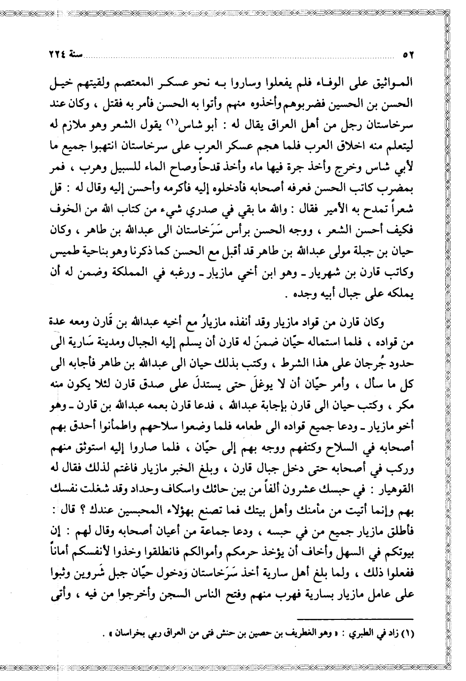 المواثيق على الوفاء فلم يفعلوا وساروا به نحو عسكر المعتصم ولقيتهم خيل الحسن بن الحسين فضربوهم وأخذوه منهم وأتوا به الحسن فأمر به فقتل وكان عند سرخاستان رجل من أهل العراق يقال له أبو شاس يقول الشعر وهو ملازم له ليتعلم منه أخلاق العرب فلما هجم عسكر العرب على سرخاستان انتهبوا جميع ما لأبي شاس وخرج وأخذ جرة فيها ماء وأخذ قدحا وصاح الماء للسبيل وهرب فمر بمضرب كاتب الحسن فعرفه أصحابه فأدخلوه إليه فأكرمه وأحسن إليه وقال له قل شعرا تمدح به الأمير فقال والله ما بقي في صدري شيء من كتاب الله من الخوف فكيف أحسن الشعر ووجه الحسن برأس سرخاستان إلى عبد الله بن طاهر وكان حيان بن جبلة مولى عبد الله بن طاهر قد أقبل مع الحسن كما ذكرنا وهو بناحية طميس وكاتب قارن بن شهريار وهو ابن أخي مازيار ورغبه في المملكة وضمن له أن يملكه على جبال أبيه وجده