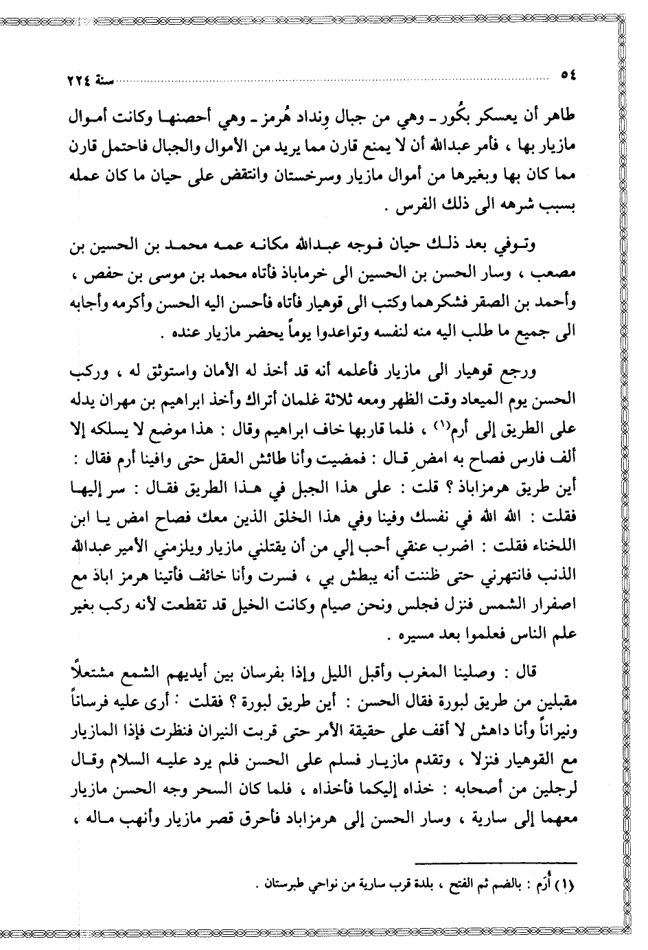 ورجع قوهيار إلى مازيار فأعلمه أنه قد أخذ له الأمان واستوثق له وركب الحسن يوم الميعاد وقت الظهر ومعه ثلاثة غلمان أتراك وأخذ إبراهيم بن مهران يدله على الطريق إلى أرم فلما قاربها خاف إبراهيم وقال هذا موضع لا يسلكه إلا ألف فارس فصاح به امض قال فمضيت وأنا طائش العقل حتى وافينا أرم فقال أين طريق هرمزاباذ قلت على هذا الجبل في هذا الطريق فقال سر إليها فقلت الله الله في نفسك وفينا وفي هذا الخلق الذين معك فصاح امض يا ابن اللخناء فقلت اضرب عنقي أحب إلي من أن يقتلني مازيار ويلزمني الأمير عبد الله الذنب فانتهرني حتى ظننت أنه يبطش بي فسرت وأنا خائف فأتينا هرمزاباذ مع اصفرار الشمس فنزل فجلس ونحن صيام وكانت الخيل قد تقطعت لأنه ركب بغير علم الناس فعلموا بعد مسيره