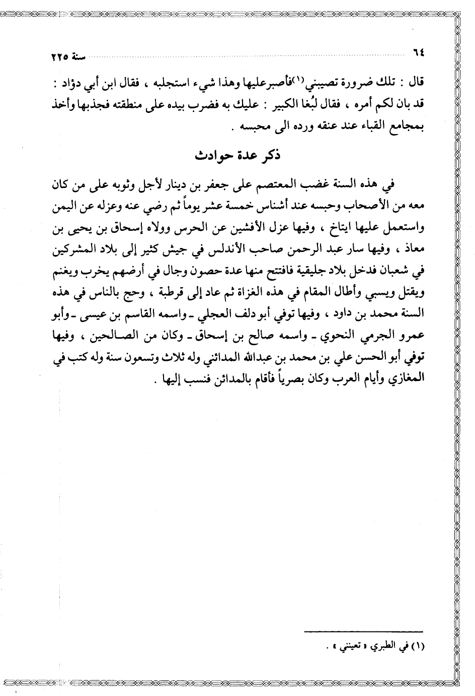 في هذه السنة غضب المعتصم على جعفر بن دينار لأجل وثوبه على من كان معه من الأصحاب وحبسه عند أشناس خمسة عشر يوما ثم رضي عنه وعزله عن اليمن واستعمل عليها إيتاخ وفيها عزل الأفشين عن الحرس وولاه إسحاق بن يحيى بن معاذ وفيها سار عبد الرحمن صاحب الأندلس في جيش كثير إلى بلاد المشركين في شعبان فدخل بلاد جليقية فافتتح منها عدة حصون وجال في أرضهم يخرب ويغنم ويقتل ويسبي وأطال المقام في هذه الغزاة ثم عاد إلى قرطبة وحج بالناس في هذه السنة محمد بن داود وفيها توفي أبو دلف العجلي واسمه القاسم بن عيسى وأبو عمرو الجرمي النحوي واسمه صالح بن إسحاق وكان من الصالحين وفيها توفي أبو الحسن علي بن محمد بن عبد الله المدائني وله ثلاث وتسعون سنة وله كتب في المغازي وأيام العرب وكان بصريا فأقام بالمدائن فنسب إليها