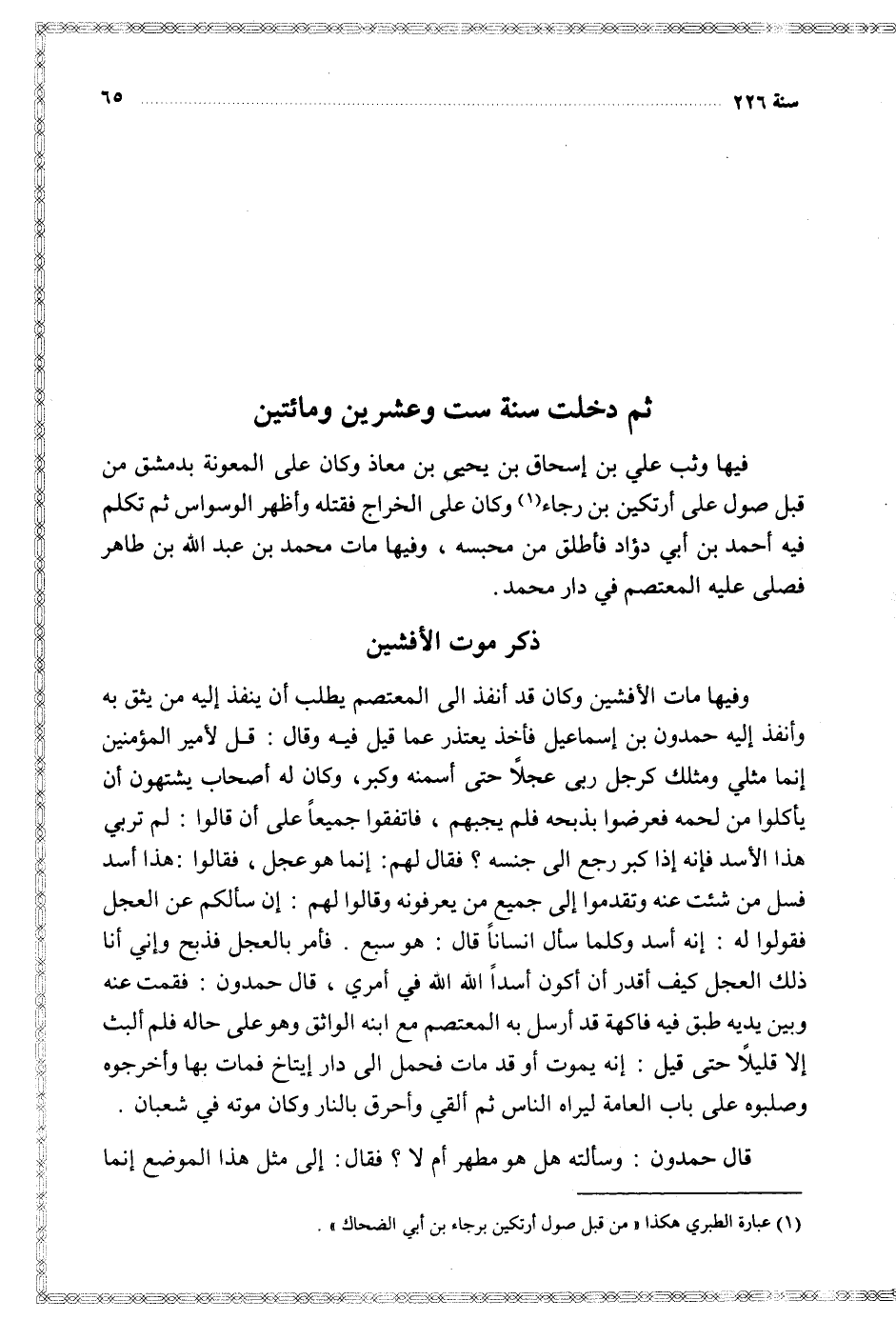 فيها وثب علي بن إسحاق بن يحيى بن معاذ وكان على المعونة بدمشق من قبل صول على أرتكين بن رجاء وكان على الخراج فقتله وأظهر الوسواس ثم تكلم فيه أحمد بن أبي داود فأطلق من محبسه وفيها مات محمد بن عبد الله بن طاهر فصلى عليه المعتصم في دار محمد