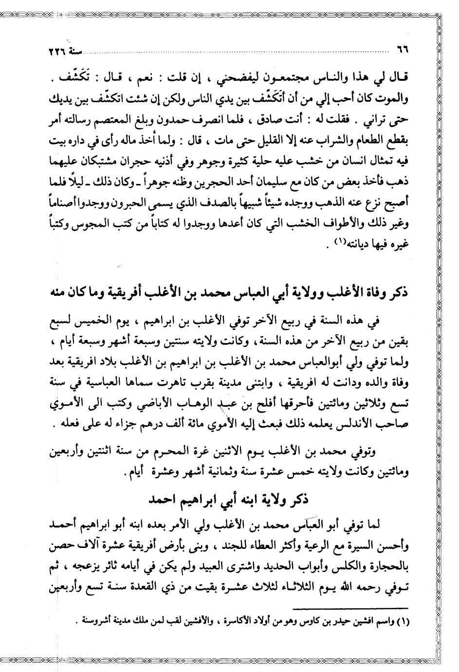 في هذه السنة في ربيع الآخر توفي الأغلب بن إبراهيم يوم الخميس لسبع بقين من ربيع الآخر من هذه السنة وكانت ولايته سنتين وسبعة أشهر وسبعة أيام ولما توفي ولي أبو العباس محمد بن الأغلب بن إبراهيم بن الأغلب بلاد أفريقية بعد وفاة والده ودانت له أفريقية وابتنى مدينة بقرب تاهرت سماها العباسية في سنة تسع وثلاثين ومائتين فأحرقها أفلح بن عبد الوهاب الأباضي وكتب إلى الأموي صاحب الأندلس يعلمه ذلك فبعث إليه الأموي مائة ألف درهم جزاء له على فعله