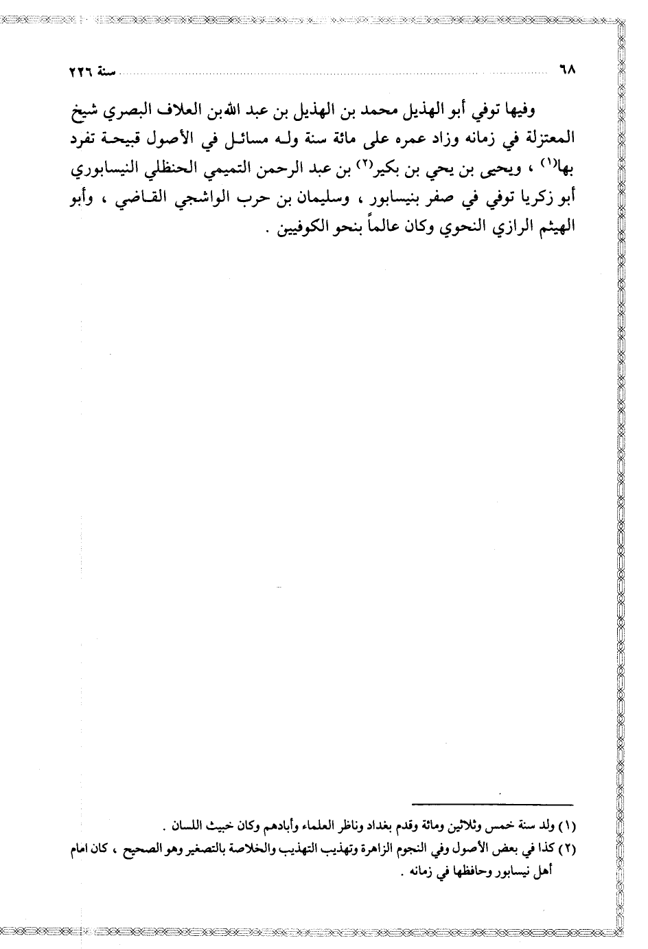 وفيها توفي أبو الهذيل محمد بن الهذيل بن عبد الله بن العلاف البصري شيخ المعتزلة في زمانه وزاد عمره على مائة سنة وله مسائل في الأصول قبيحة تفرد بها ويحيى بن يحيى بن بكير بن عبد الرحمن التميمي الحنظلي النيسابوري أبو زكريا توفي في صفر بنيسابور وسليمان بن حرب الواشجي القاضي وأبو الهيثم الرازي النحوي وكان عالما بنحو الكوفيين