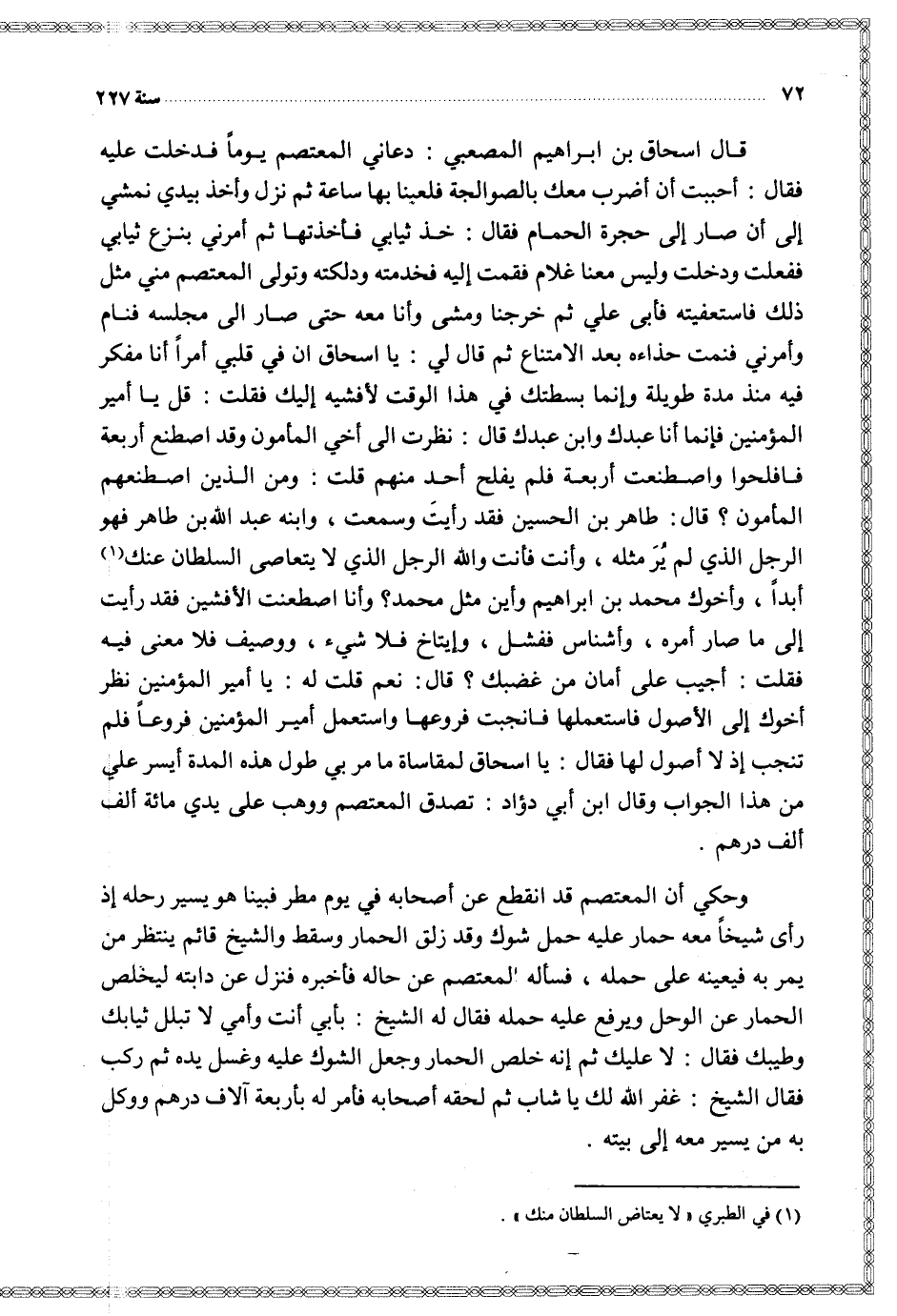 قال إسحاق بن إبراهيم المصعبي دعاني المعتصم يوما فدخلت عليه فقال أحببت أن أضرب معك بالصوالجة فلعبنا بها ساعة ثم نزل وأخذ بيدي نمشي إلى أن صار إلى حجرة الحمام فقال خذ ثيابي فأخذتها ثم أمرني بنزع ثيابي ففعلت ودخلت وليس معنا غلام فقمت إليه فخدمته ودلكته وتولى المعتصم مني مثل ذلك فاستعفيته فأبى علي ثم خرجنا ومشى وأنا معه حتى صار إلى مجلسه فنام وأمرني فنمت حذاءه بعد الامتناع ثم قال لي يا إسحاق إن في قلبي أمرا أنا مفكر فيه منذ مدة طويلة وإنما بسطتك في هذا الوقت لأفشيه إليك فقلت قل يا أمير المؤمنين فإنما أنا عبدك وابن عبدك قال نظرت إلى أخي المأمون وقد اصطنع أربعة فافلحوا واصطنعت أربعة فلم يفلح أحد منهم قلت ومن الذين اصطنعهم المأمون قال طاهر بن الحسين فقد رأيت وسمعت وابنه عبد الله بن طاهر فهو الرجل الذي لم ير مثله وأنت فأنت والله الرجل الذي لا يتعاصى السلطان عنك أبدا وأخوك محمد بن إبراهيم وأين مثل محمد وأنا اصطنعت الأفشين فقد رأيت إلى ما صار أمره وأشناس ففشل وإيتاخ فلا شيء ووصيف فلا معنى فيه فقلت أجيب على أمان من غضبك قال نعم قلت له يا أمير المؤمنين نظر أخوك إلى الأصول فاستعملها فانجبت فروعها واستعمل أمير المؤمنين فروعا فلم تنجب إذ لا أصول لها فقال يا إسحاق لمقاساة ما مر بي طول هذه المدة أيسر علي من هذا الجواب وقال ابن أبي داود تصدق المعتصم ووهب على يدي مائة ألف ألف درهم