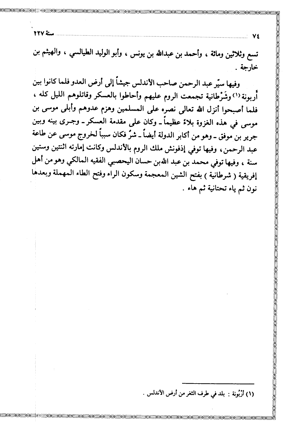 وفيها سير عبد الرحمن صاحب الأندلس جيشا إلى أرض العدو فلما كانوا بين أربونة وشرطانية تجمعت الروم عليهم وأحاطوا بالعسكر وقاتلوهم الليل كله فلما أصبحوا أنزل الله تعالى نصره على المسلمين وهزم عدوهم وأبلى موسى بن موسى في هذه الغزوة بلاء عظيما وكان على مقدمة العسكر وجرى بينه وبين جرير بن موفق وهو من أكابر الدولة أيضا شر فكان سببا لخروج موسى عن طاعة عبد الرحمن وفيها توفي إذفونش ملك الروم بالأندلس وكانت إمارته إثنين وستين سنة وفيها توفي محمد بن عبد الله بن حسان اليحصبي الفقيه المالكي وهو من أهل إفريقية ( شرطانية ) بفتح الشين المعجمة وسكون الراء وفتح الطاء المهملة وبعدها نون ثم ياء تحتانية ثم هاء