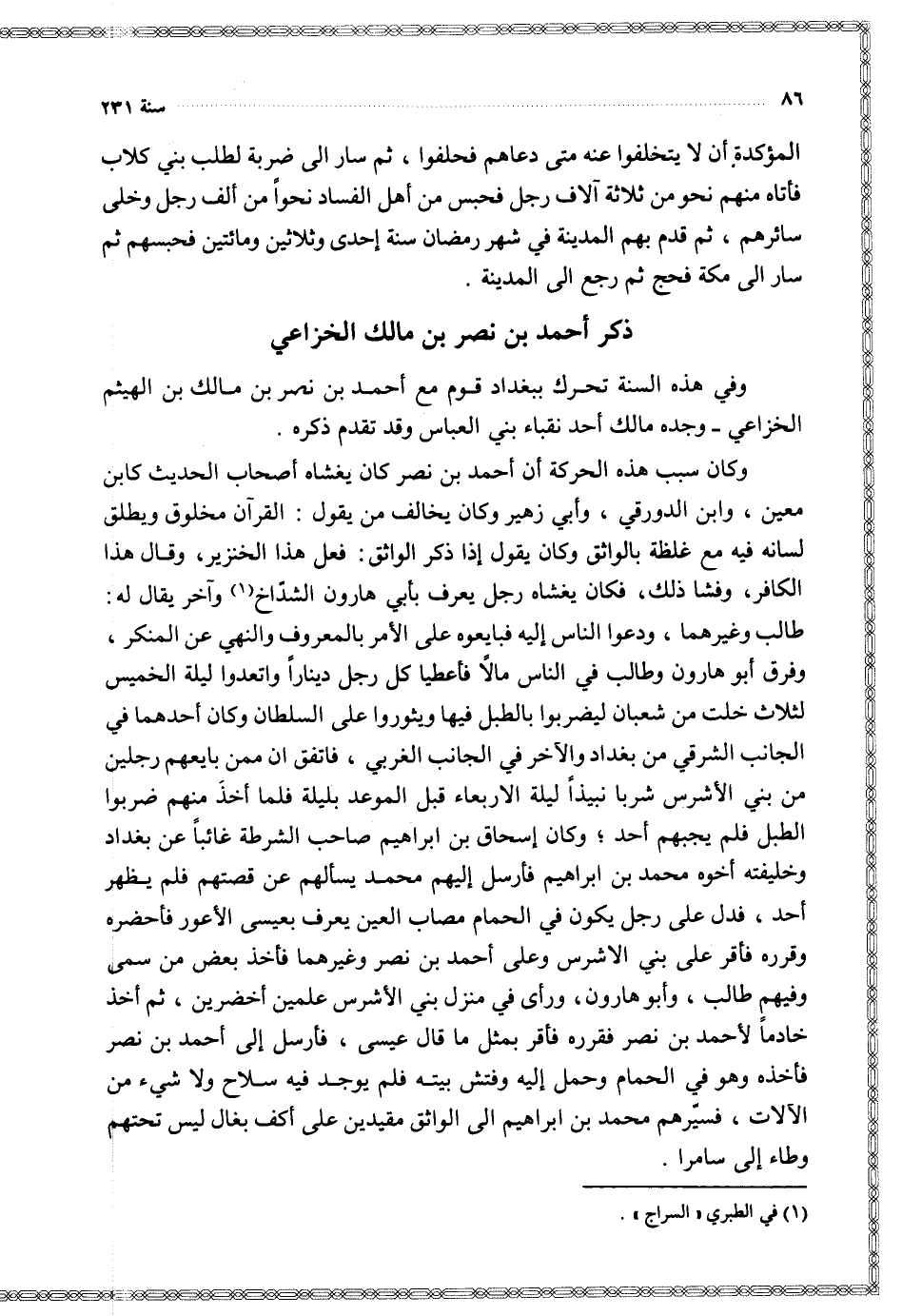 وكان سبب هذه الحركة أن أحمد بن نصر كان يغشاه أصحاب الحديث كابن معين وابن الدورقي وأبي زهير وكان يخالف من يقول القرآن مخلوق ويطلق لسانه فيه مع غلظة بالواثق وكان يقول إذا ذكر الواثق فعل هذا الخنزير وقال هذا الكافر وفشا ذلك فكان يغشاه رجل يعرف بأبي هارون الشداخ وآخر يقال له طالب وغيرهما ودعوا الناس إليه فبايعوه على الأمر بالمعروف والنهي عن المنكر وفرق أبو هارون وطالب في الناس مالا فأعطيا كل رجل دينار واتعدوا ليلة الخميس لثلاث خلت من شعبان ليضربوا بالطبل فيها ويثوروا على السلطان وكان أحدهما في الجانب الشرقي من بغداد والآخر في الجانب الغربي فاتفق أن ممن بايعهم رجلين من بين الأشرس شربا نبيذا ليلة الأربعاء قبل الموعد بليلة فلما أخذ منهم ضربوا الطبل فلم يجبهم أحد وكان إسحاق بن إبراهيم صاحب الشرطة غائبا عن بغداد وخليفته أخوه محمد بن إبراهيم فأرسل إليهم محمد يسألهم عن قصتهم فلم يظهر أحد فدل على رجل يكون في الحمام مصاب العين يعرف بعيسى الأعور فأحضره وقرره فأقر على بني الأشرس وعلى أحمد بن نصر وغيرهما فأخذ بعض من سمى وفيهم طالب وأبو هارون ورأى في منزل بين الأشرس علمين أخضرين ثم أخذ خادما لأحمد بن نصر فقرره فأقر بمثل ما قال عيسى فأرسل إلى أحمد بن نصر فأخذه وهو في الحمام وحمل إليه وفتش بيته فلم يوجد فيه سلاح ولا شيء من الآلات فسيرهم محمد بن إبراهيم إلى الواثق مقيدين على أكف بغال ليس تحتهم وطاء إلى سامرا