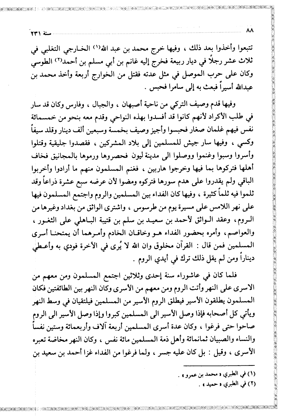 فما كان في عاشوراء سنة إحدى وثلاثين اجتمع المسلمون ومن معهم من الأسرى على النهر وأتت الروم ومن معهم من الأسرى وكان النهر بين الطائفتين فكان المسلمون يطلقون الأسير فيطلق الروم الأسير من المسلمين فيلتقيان في وسط النهر ويأتي كل أصحابه فإذا وصل الأسير إلى المسلمين كبروا وإذا وصل الأسير إلى الروم صاحوا حتى فرغوا وكان عدة أسرى المسلمين أربعة آلاف وأربعمائة وستين نفسا والنساء والصبيان ثمانمائة وأهل ذمة المسلمين مائة نفس وكان النهر مخاضة تعبره الأسرى وقيل بل كان عليه جسر ولما فرغوا من الفداء غزا أحمد بن سعيد بن