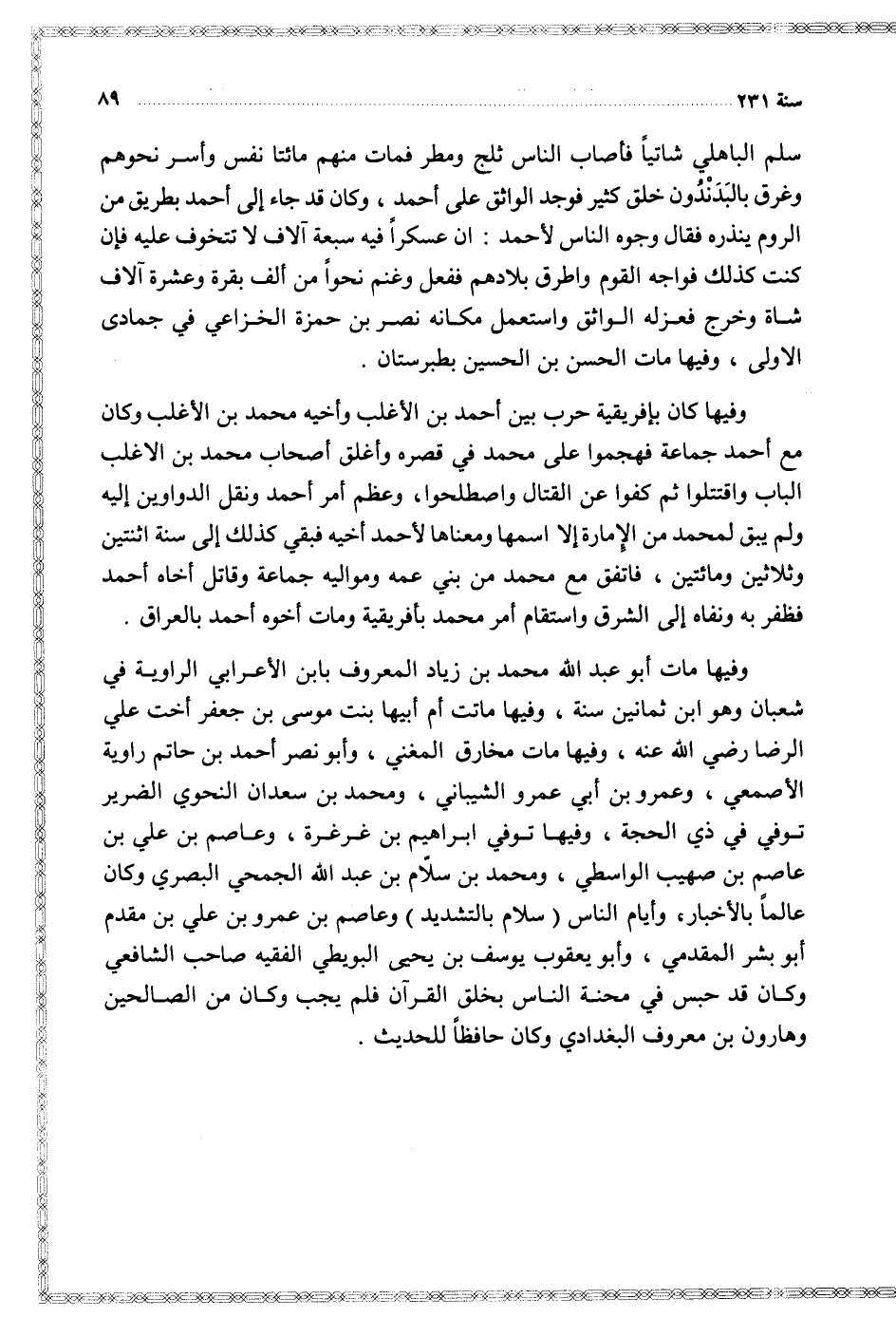 وفيها مات أبو عبد الله محمد بن زياد المعروف بابن الأعرابي الراوية في شعبان وهو ابن ثمانين سنة وفيها ماتت أم أبيها بنت موسى بن جعفر أخت علي الرضا رضي الله عنه وفيها مات مخارق المغني وأبو نصر أحمد بن حاتم راوية الأصمعي وعمرو بن أبي عمرو الشيباني ومحمد بن سعدان النحوي الضرير توفي في ذي الحجة وفيها توفي إبراهيم بن غرغرة وعاصم بن علي بن عاصم بن صهيب الواسطي ومحمد بن سلام بن عبد الله الجمحي البصري وكان عالما بالأخبار وأيام الناس ( سلام بالتشديد ) وعاصم بن عمرو بن علي بن مقدم أبو بشر المقدمي وأبو يعقوب يوسف بن يحيى البويطي الفقيه صاحب الشافعي وكان قد حبس في محنة الناس بخلق القرآن فلم يجب وكان من الصالحين وهارون بن معروف البغدادي وكان حافظا للحديث