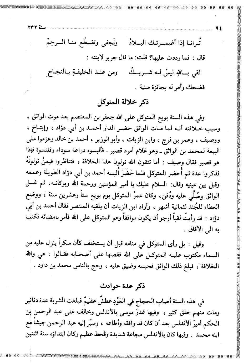 وفي هذه السنة بويع المتوكل على الله جعفر بن المعتصم بعد موت الواثق وسبب خلافته أنه لما مات الواثق حضر الدار أحمد بن أبي دؤاد وإيتاخ ووصيف وعمر بن فرج وابن الزيات وأبو الوزير أحمد بن خالد وعزموا على البيعة لمحمد بن الواثق وهو غلام أمرد قصير فألبسوه دراعة سوداء وقلنسوة فإذا هو قصير فقال وصيف أما تتقون الله تولون هذا الخلافة فتناظروا فيمن تولونه فذكروا عدة ثم أحضر المتوكل فلما حضر ألبسه أحمد بن أبي دؤاد الطويلة وعممه وقبل بين عينيه وقال السلام عليك يا أمير المؤمنين ورحمة الله وبركاته ثم غسل الواثق وصلي عليه ودفن وكان عمر المتوكل يوم بويع ستا وعشرين سنة ووضع العطاء للجند لثمانية أشهر وأراد ابن الزيات أن يلقيه المنتصر فقال أحمد بن أبي دؤاد قد رأيت لقبا أرجو أن يكون موافقا وهو المتوكل على أمر الله فأمر بامضائه فكتب به إلى الآفاق