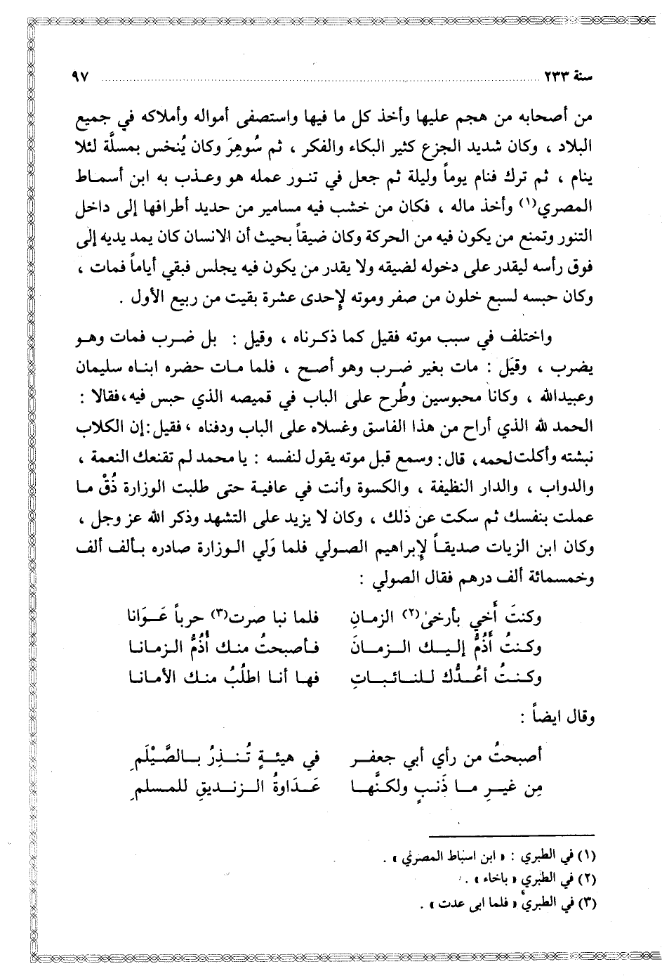 واختلف في سبب موته فقيل كما ذكرناه وقيل بل ضرب فمات وهو يضرب وقيل مات بغير ضرب وهو أصح فلما مات حضره أبناء سليمان وعبيد الله وكانا محبوسين وطرح على الباب في قميصه الذي حبس فيه فقالا الحمد لله الذي أراح من هذا الفاسق وغسلاه على الباب ودفناه فقيل إن الكلاب نبشته وأكلت لحمه قال وسمع قبل موته يقول لنفسه يا محمد لم تقنعك النعمة والدواب والدار النظيفة والكسوة وأنت في عافية حتى طلبت الوزارة ذق ما عملت بنفسك ثم سكت عن ذلك وكان لا يزيد على التشهد وذكر الله عز وجل وكان ابن الزيات صديقا لإبراهيم الصولي فلما ولي الوزارة صادره بألف ألف وخمسمائة ألف درهم فقال الصولي