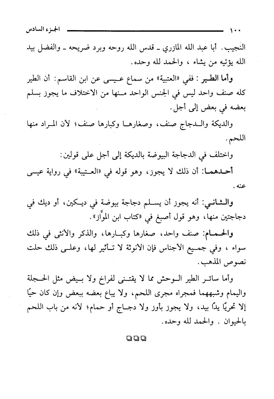 وأما الطير: ففي "العتبية" من سماع عيسى عن ابن القاسم: أن الطير كله صنف واحد ليس في الجنس الواحد منها من الاختلاف ما يجوز بسلم بعضه في بعض إلى أجل.