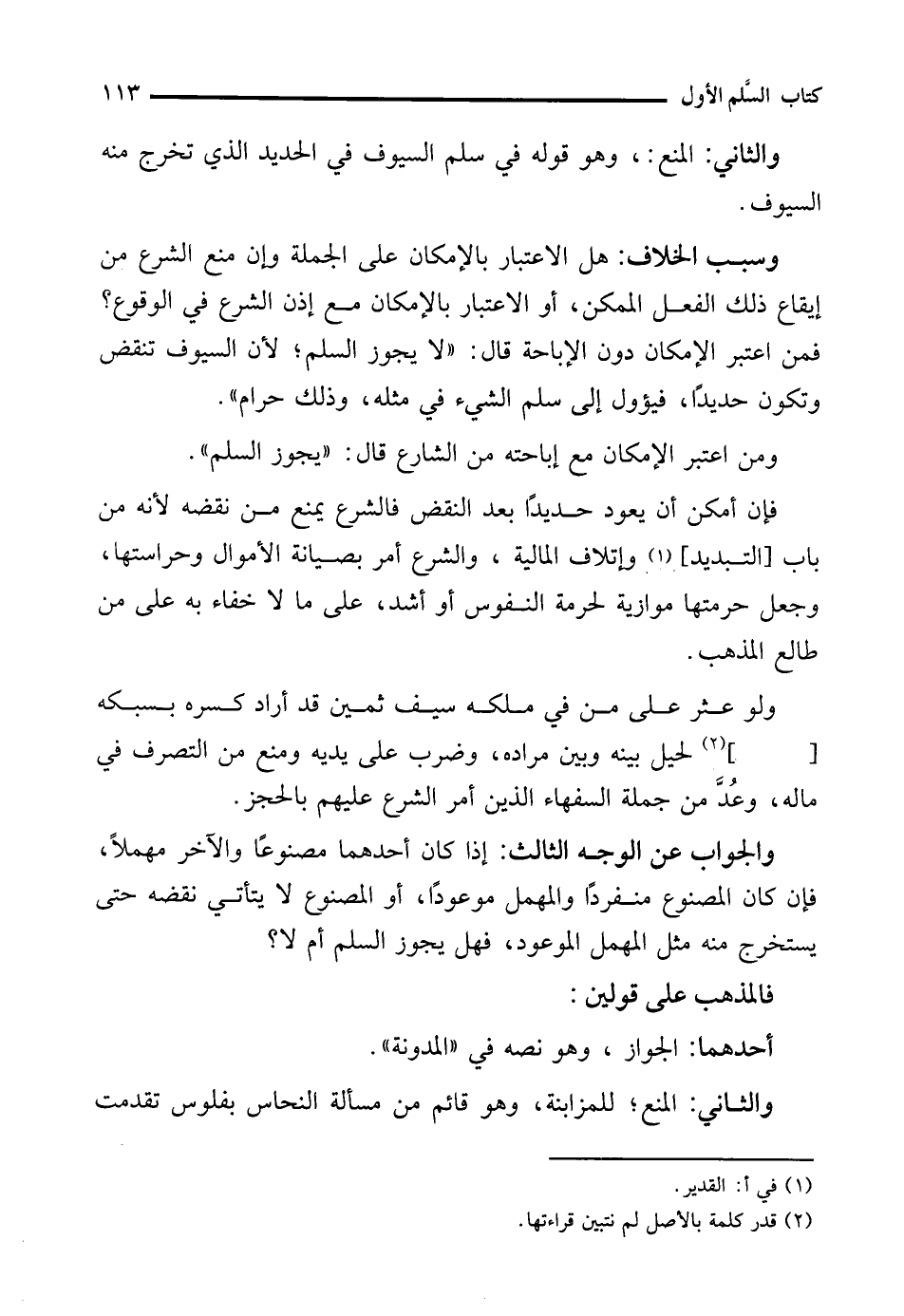 وسبب الخلاف: هل الاعتبار بالإمكان على الجملة وإن منع الشرع من إيقاع ذلك الفعل الممكن، أو الاعتبار بالإمكان مع إذن الشرع في الوقوع؟ فمن اعتبر الإمكان دون الإباحة قال: "لا يجوز السلم؛ لأن السيوف تنقض وتكون حديدًا، فيؤول إلى سلم الشيء في مثله، وذلك حرام".
