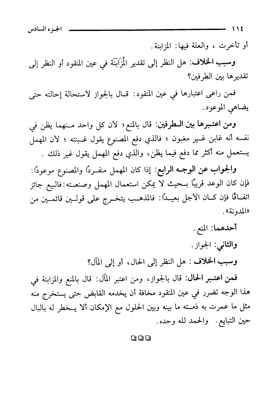 والجواب عن الوجه الرابع: إذا كان المهمل منفردًا والمصنوع موعودًا: فإن كان الوعد قريبًا بحيث لا يمكن استعمال المهمل وصنعته: فالبيع جائز اتفاقًا فإن كان الأجل بعيدًا: فالمذهب يتخرج على قولين قائمين من "المدونة".