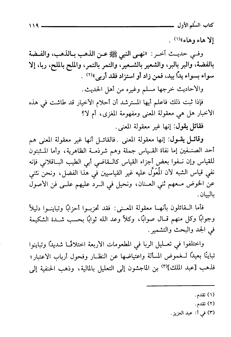 وقائل يقول: إنها معقولة المعنى. فالقائل أنها غير معقولة المعنى هم أحد الصنفين إما نفاة القياس جملة وهم شرذمة الظاهرية، وأما المثبتون للقياس وإن نفوا بعض أجزاء القياس كالقاضي أبي الطيب الباقلاني فإنه نفي قياس الشبه لأن المُعَوَّل عليه غير القياسيين في هذا الفضل، ونحن نثني عن الخوض معهم ثني العنان، ونحيل في الرد عليهم على فن الأصول بالبيان.