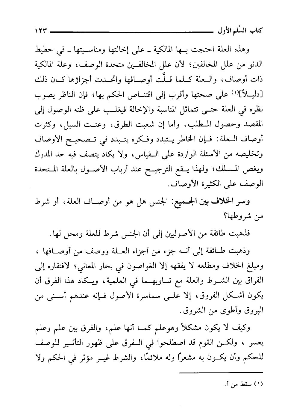 وذهبت طائفة إلى أنه جزء من أجزاء العلة ووصف من أوصافها، ومبلغ الخلاف ومطلعه لا يفقهه إلا الغواصون في بحار المعاني؛ لافتقاره إلى الفراق بين الشرط والعلة مع تساويهما في العلمية، ويكاد هذا الفرق أن يكون أشكل الفروق، إلا على سماسرة الأصول فإنه عندهم أسنى من البروق وأطوى من الشروق.
