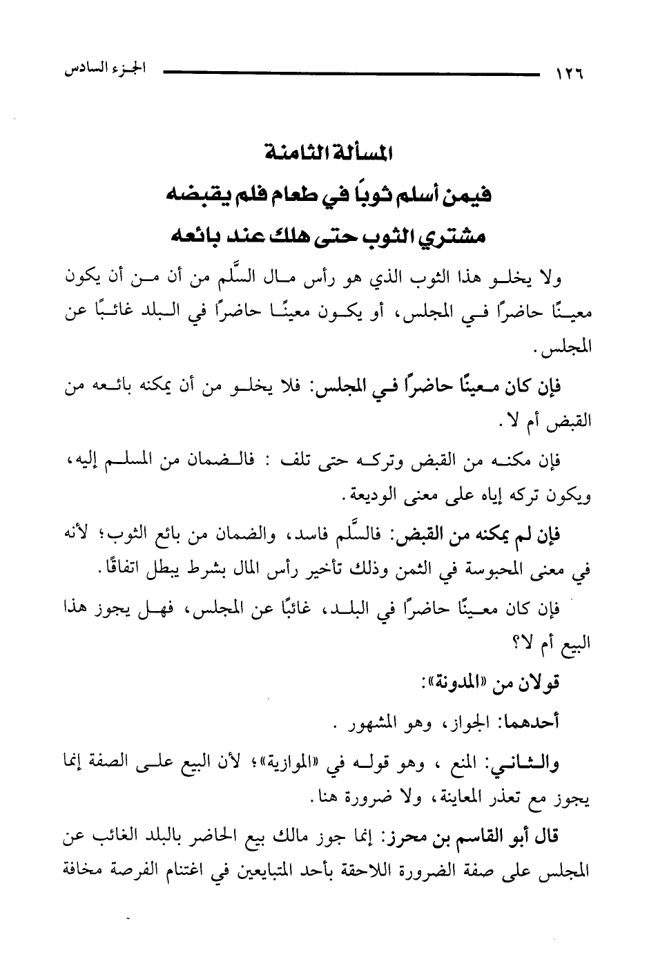 ولا يخلو هذا الثوب الذى هو رأس مال السَّلم من أن من أن يكون معينًا حاضرًا في المجلس، أو يكون معينًا حاضرًا في البلد غائبًا عن المجلس.