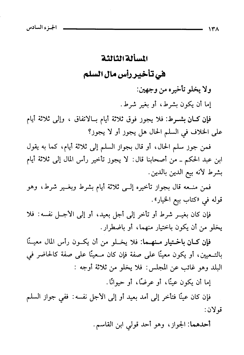 فمن جوز سلم الحال، أو قال بجواز السلم إلى ثلاثة أيام، كما به يقول ابن عبد الحكم -من أصحابنا قال: لا يجوز تأخير رأس المال إلى ثلاثة أيام بشرط لأنه بيع الدين بالدين.