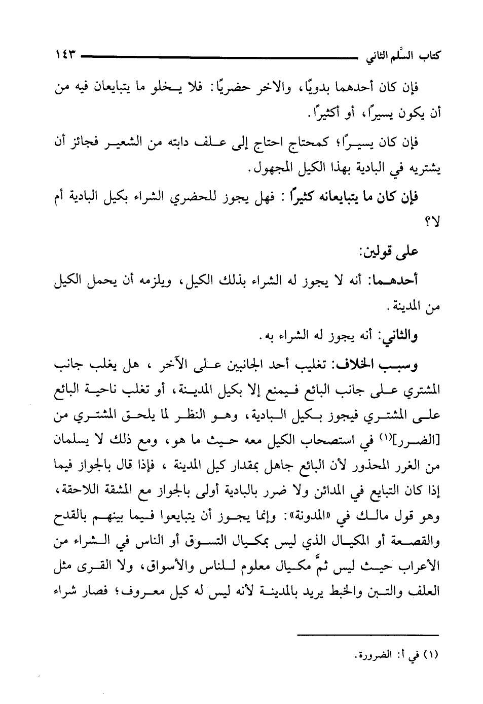 وسبب الخلاف: تغليب أحد الجانبين علي الآخر، هل يغلب جانب المشتري على جانب البائع فيمنع إلا بكيل المدينة، أو تغلب ناحية البائع على المشتري فيجوز بكيل البادية، وهو النظر لما يلحق المشتري من [الضرر] (¬1) في استصحاب الكيل معه حيث ما هو، ومع ذلك لا يسلمان من الغرر المحذور لأن البائع جاهل بمقدار كيل المدينة، فإذا قال بالجواز فيما إذا كان التبايع في المدائن ولا ضرر بالبادية أولى بالجواز مع المشقة اللاحقة، وهو قول مالك في "المدونة": وإنما يجوز أن يتبايعوا فيما بينهم بالقدح والقصعة أو المكيال الذي ليس بمكيال التسوق أو الناس في الشراء من الأعراب حيث ليس ثمَّ مكيال معلوم للناس والأسواق، ولا القرى مثل العلف والتبن والخبط يريد بالمدينة لأنه ليس له كيل معروف؛ فصار شراء
