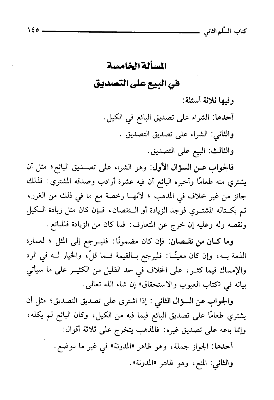 والجواب عن السؤال الثاني: إذا اشترى على تصديق التصديق؛ مثل أن يشتري طعامًا على تصديق البائع فيما فيه من الكيل، وكان البائع لم يكله، وإنما باعه على تصديق غيره: فالمذهب يتخرج على ثلاثة أقوال: