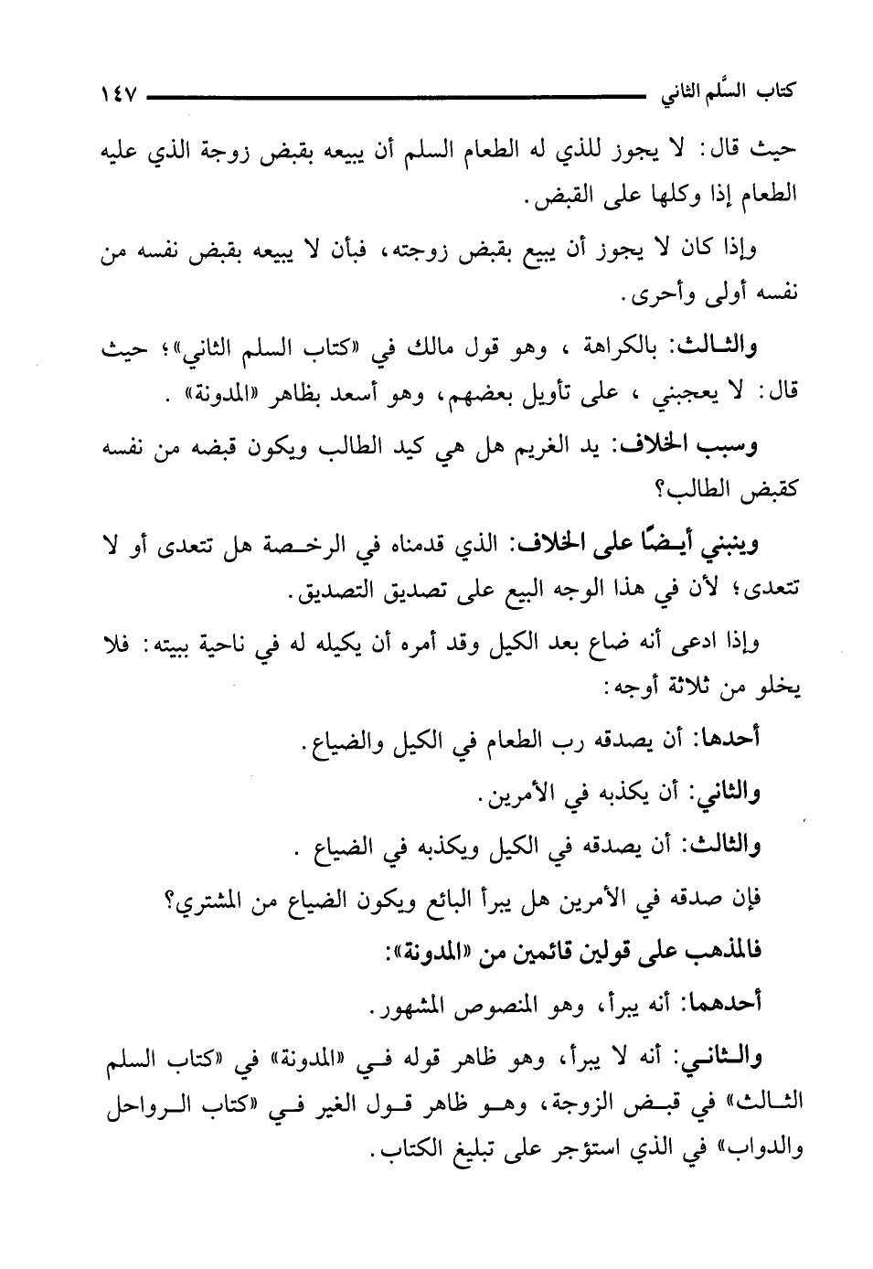 والثالث: بالكراهة، وهو قول مالك في "كتاب السلم الثاني"؛ حيث قال: لا يعجبني، على تأويل بعضهم، وهو أسعد بظاهر "المدونة".