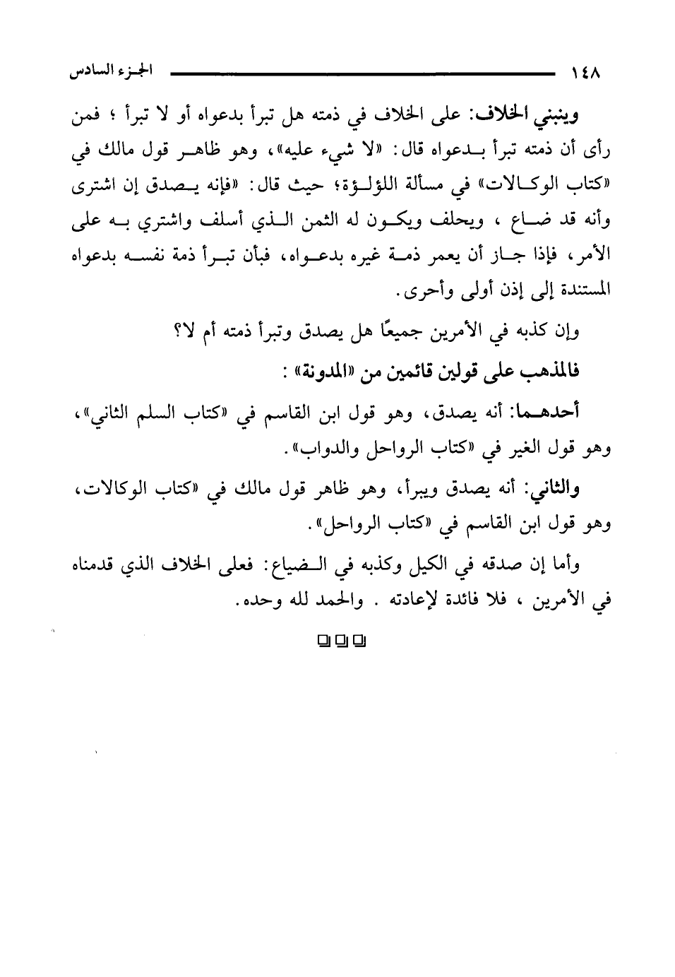 وينبني الخلاف: على الخلاف في ذمته هل تبرأ بدعواه أو لا تبرأ؛ فمن رأى أن ذمته تبرأ بدعواه قال: "لا شيء عليه"، وهو ظاهر قول مالك في "كتاب الوكالات" في مسألة اللؤلؤة؛ حيث قال: "فإنه يصدق إن اشترى وأنه قد ضاع، ويحلف ويكون له الثمن الذي أسلف واشتري به على الأمر، فإذا جاز أن يعمر ذمة غيره بدعواه، فبأن تبرأ ذمة نفسه بدعواه المستندة إلى إذن أولى وأحرى.