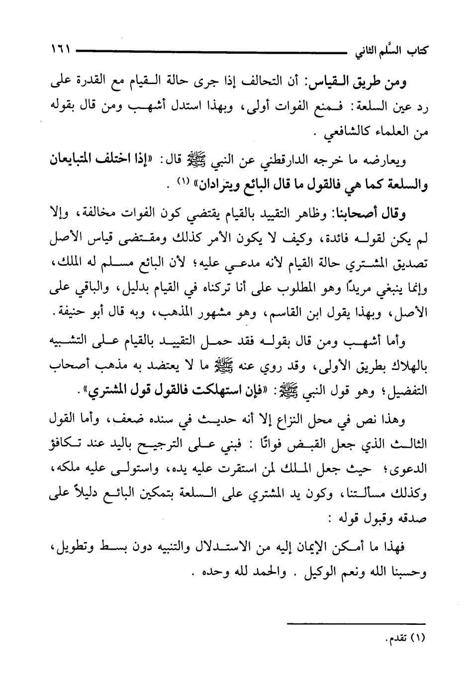 وهذا نص في محل النزاع إلا أنه حديث في سنده ضعف، وأما القول الثالث الذي جعل القبض فواتًا: فبني على الترجيح باليد عند تكافؤ الدعوى؛ حيث جعل الملك لمن استقرت عليه يده، واستولى عليه ملكه، وكذلك مسألتنا، وكون يد المشتري على السلعة بتمكين البائع دليلًا على صدقه وقبول قوله: