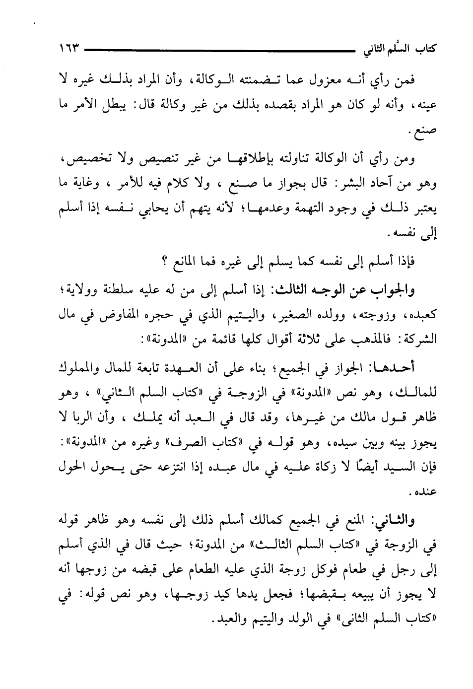 والثاني: المنع في الجميع كمالك أسلم ذلك إلى نفسه وهو ظاهر قوله في الزوجة في "كتاب السلم الثالث" من المدونة؛ حيث قال في الذي أسلم إلى رجل في طعام فوكل زوجة الذي عليه الطعام على قبضه من زوجها أنه لا يجوز أن يبيعه بقبضها؛ فجعل يدها كيد زوجها، وهو نص قوله: في "كتاب السلم الثاني" في الولد واليتيم والعبد.