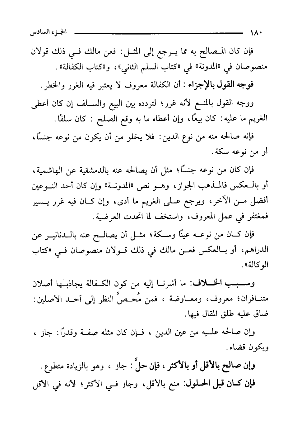 وسبب الخلاف: ما أشرنا إليه من كون الكفالة يجاذبها أصلان متنافران؛ معروف، ومعاوضة، فمن مُحصَّ النظر إلى أحد الأصلين: ضاق عليه طلق المقال فيها.