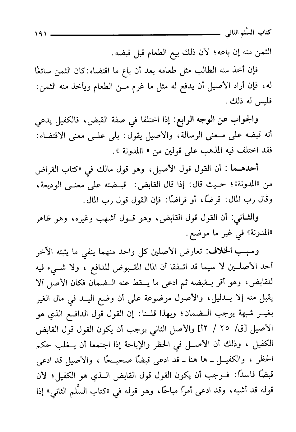 والجواب عن الوجه الرابع: إذا اختلفا في صفة القبض، فالكفيل يدعي أنه قبضه على معنى الرسالة، والأصيل يقول: بلى على معنى الاقتضاء: فقد اختلف فيه المذهب على قولين من "المدونة".
