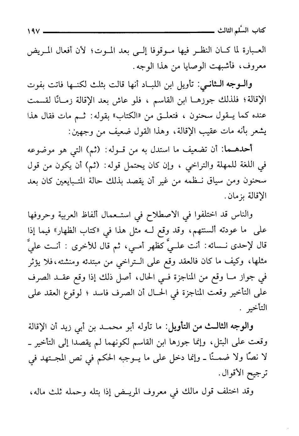 والوجه الثالث من التأويل: ما تأوله أبو محمَّد بن أبي زيد أن الإقالة وقعت على البتل، وإنما جوزها ابن القاسم لكونهما لم يقصدا إلى التأخير -لا نصًا ولا ضمنًا- وإنما دخل على ما يوجبه الحكم في نص المجتهد في ترجيح الأقوال.
