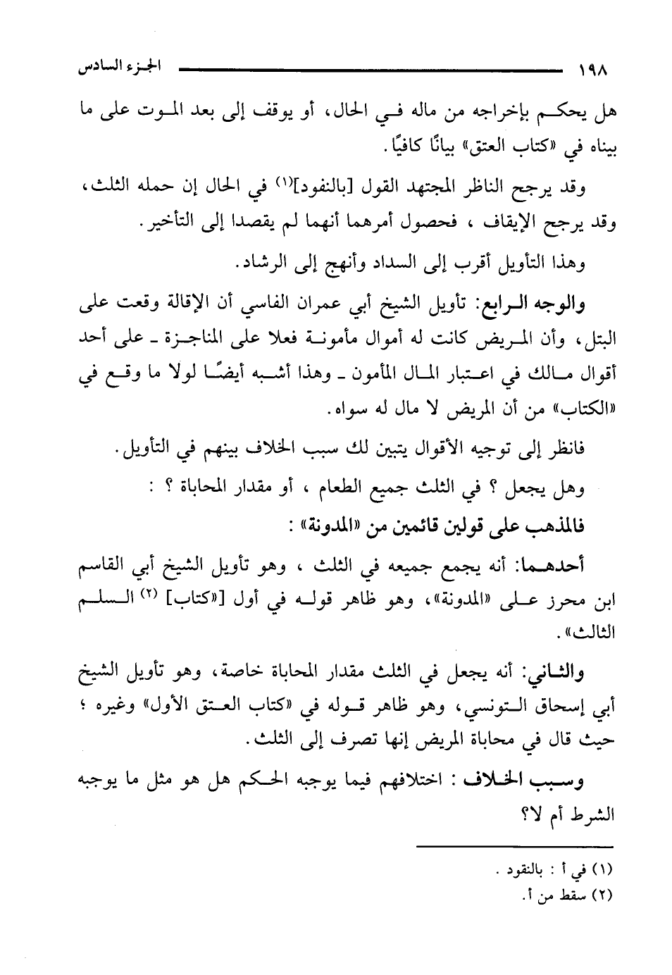 والثاني: أنه يجعل في الثلث مقدار المحاباة خاصة، وهو تأويل الشيخ أبي إسحاق التونسي، وهو ظاهر قوله في "كتاب العتق الأول" وغيره؛ حيث قال في محاباة المريض إنها تصرف إلى الثلث.