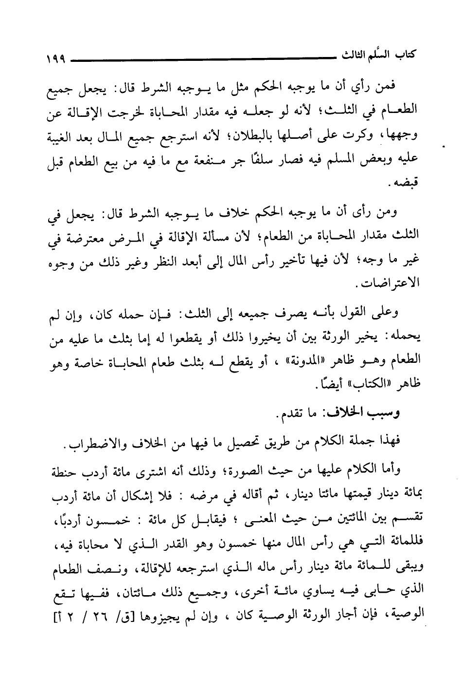 ومن رأى أن ما يوجبه الحكم خلاف مما يوجبه الشرط قال: يجعل في الثلث مقدار المحاباة من الطعام؛ لأن مسألة الإقالة في المرض معترضة في غير ما وجه؛ لأن فيها تأخير رأس المال إلى أبعد النظر وغير ذلك من وجوه الاعتراضات.