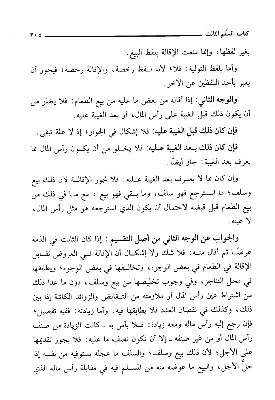 والجواب عن الوجه الثاني من أصل التقسيم: إذا كان الثابت في الذمة عرضًا ثم أقال منه: فلا شك ولا إشكال أن الإقالة في العروض تقابل الإقالة في الطعام في بعض الوجوه، وتخالفها في بعض الوجوه؛ ويطابقها في محل التناجز، وفي وجوب تخليصها من بيع وسلف، دون ما عدا ذلك من اشتراط عين رأس المال أو ملازمته من التقابض والزوائد الكائنة إذا بين ذلك، وكذلك في نقصان العدد فلا يطابقها فيه. وأما زيادته: ففيه تفصيل؛ فإن رجع إليه رأس ماله ومعه زيادة: فلا بأس به -كانت الزيادة من صنف رأس المال أو من غير صنفه- إلا أن تكون نصف ما عليه: فلا يجوز تقديمها على الأجل؛ لأن ذلك بيع وسلف؛ والسلف ما عجله يستوفيه من نفسه إذا حلَّ الأجل، والبيع ما عوضه منه من المسلم فيه في مقابلة رأس ماله الذي