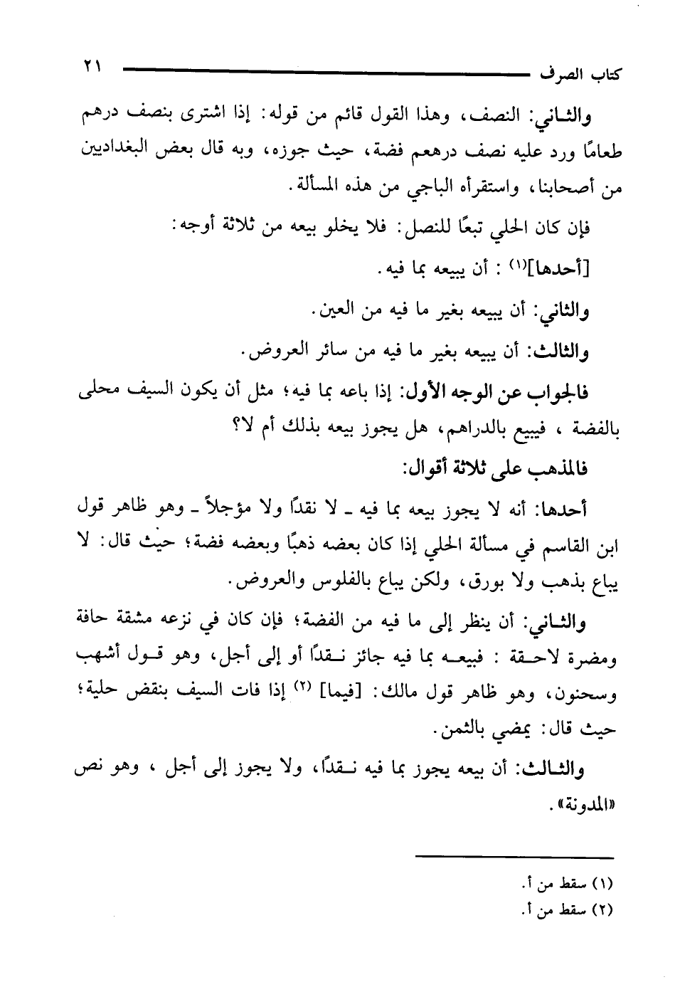 والثاني: أن ينظر إلى ما فيه من الفضة؛ فإن كان في نزعه مشقة حافة ومضرة لاحقة: فبيعه بما فيه جائز نقدًا أو إلى أجل، وهو قول أشهب وسحنون، وهو ظاهر قول مالك: [فيما] (¬2) إذا فات السيف بنقض حلية؛ حيث قال: يمضي بالثمن.