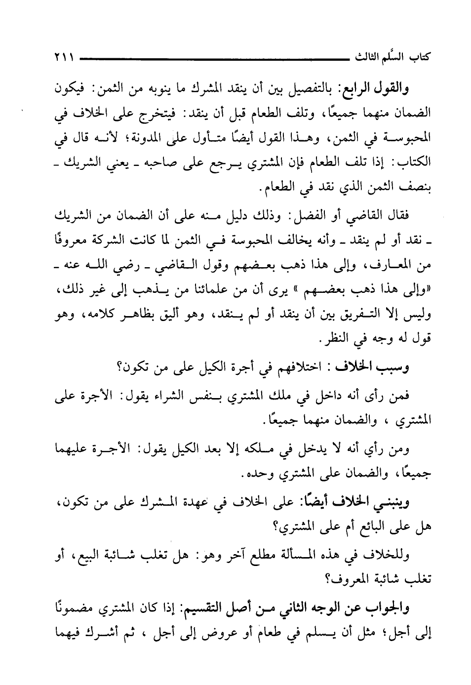 فقال القاضي أو الفضل: وذلك دليل منه على أن الضمان من الشريك -نقد أو لم ينقد- وأنه يخالف المحبوسة في الثمن لما كانت الشركة معروفًا من المعارف، وإلى هذا ذهب بعضهم وقول القاضي - رضي الله عنه - "وإلى هذا ذهب بعضهم" يرى أن من علمائنا من يذهب إلى غير ذلك، وليس إلا التفريق بين أن ينقد أو لم ينقد، وهو أليق بظاهر كلامه، وهو قول له وجه في النظر.