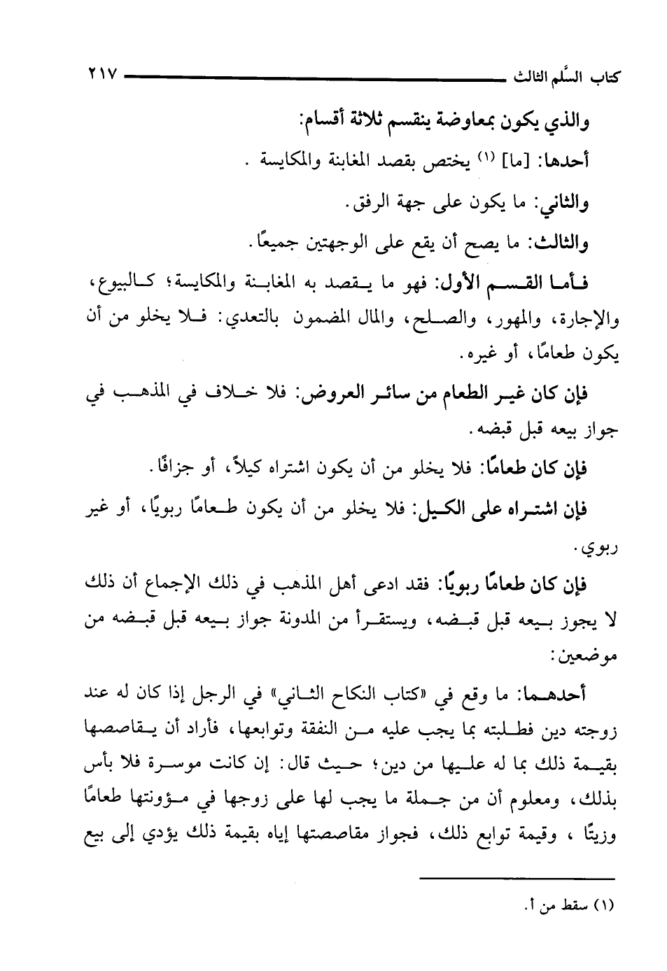 فأما القسم الأول: فهو ما يقصد به المغابنة والمكايسة؛ كالبيوع، والإجارة، والمهور، والصلح، والمال المضمون بالتعدي: فلا يخلو من أن يكون طعامًا، أو غيره.