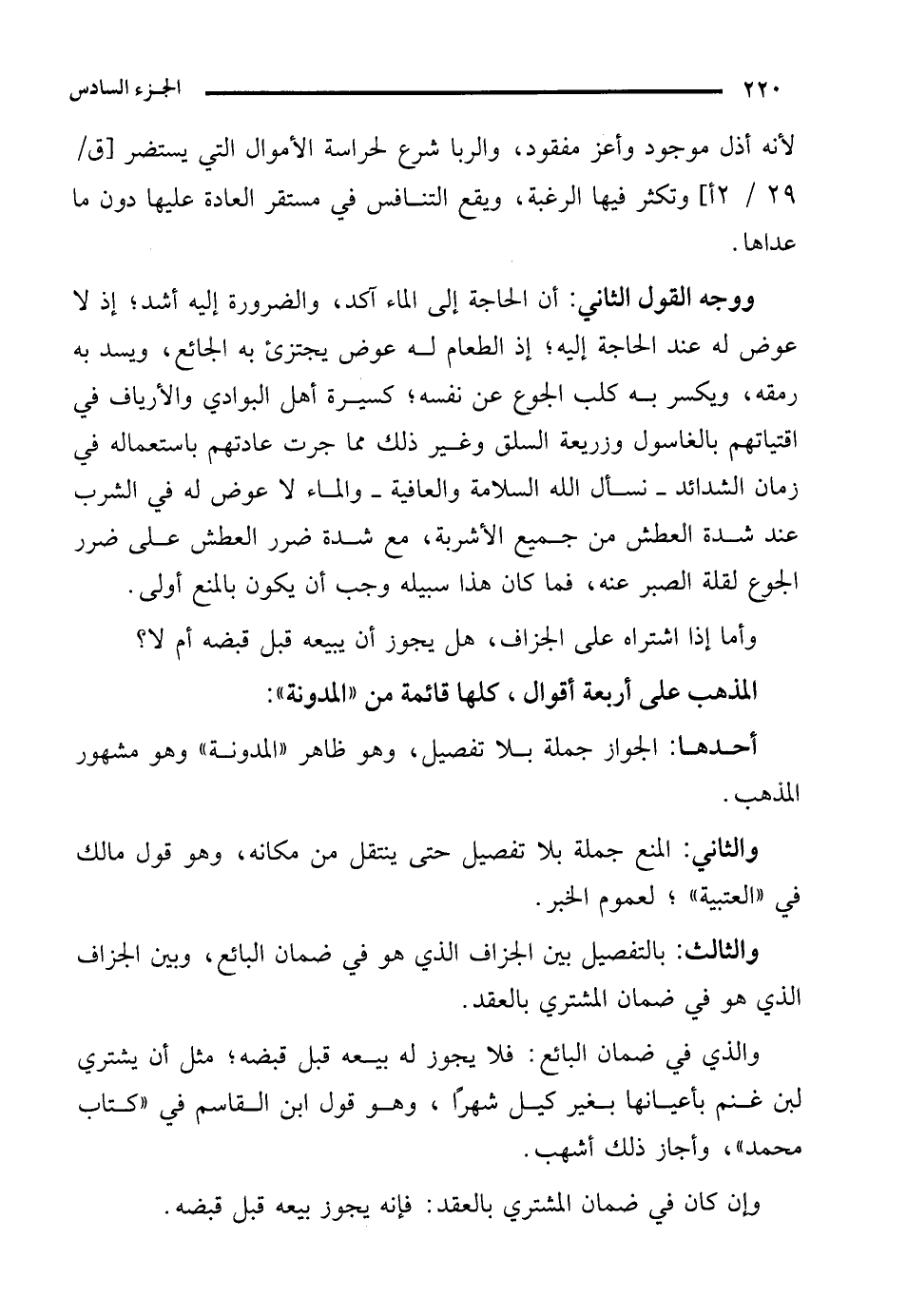 ووجه القول الثاني: أن الحاجة إلى الماء آكد، والضرورة إليه أشد؛ إذ لا عوض له عند الحاجة إليه؛ إذ الطعام له عوض يجتزئ به الجائع، ويسد به رمقه، ويكسر به كلب الجوع عن نفسه؛ كسيرة أهل البوادي والأرياف في اقتياتهم بالغاسول وزريعة السلق وغير ذلك مما جرت عادتهم باستعماله في زمان الشدائد -نسأل الله السلامة والعافية- والماء لا عوض له في الشرب عند شدة العطش من جميع الأشربة، مع شدة ضرر العطش على ضرر الجوع لقلة الصبر عنه، فما كان هذا سبيله وجب أن يكون بالمنع أولى.