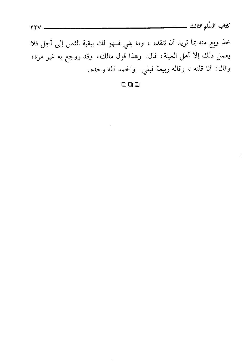 خذ وبع منه بما تريد أن تنقده، وما بقي فهو لك ببقية الثمن إلى أجل فلا يعمل ذلك إلا أهل العينة، قال: وهذا قول مالك، وقد روجع به غير مرة، وقال: أنا قلته، وقاله ربيعة قبلي. والحمد لله وحده.